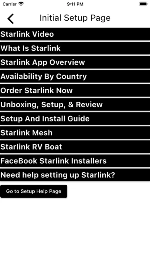 The Initial Setup page describes how to unbox & connect all equipment and wiring, install dishy (the Starlink Antenna), and configure the WiFi router. It also has YouTube links to explain how to unbox, install Dishy, configure your wifi router, and how to run a network cable.