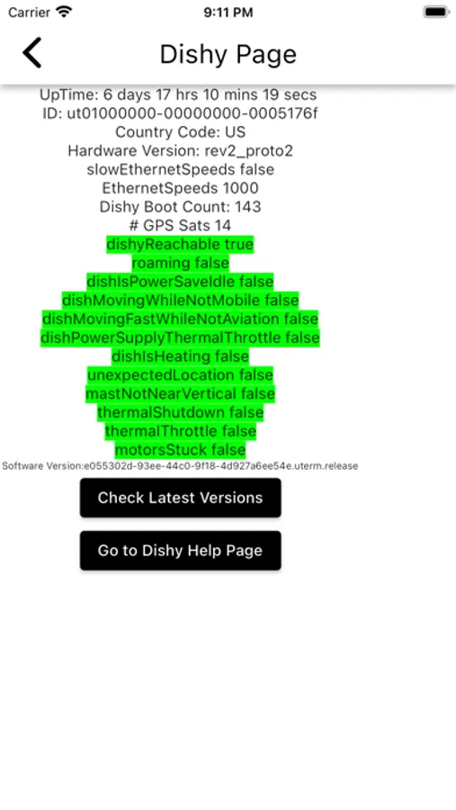 The Dishy page displays your antenna/Dishy uptime, physical issues (if the motors are stuck, an issue with temperature, mast not level, or unexpected location), and hardware & software versions.