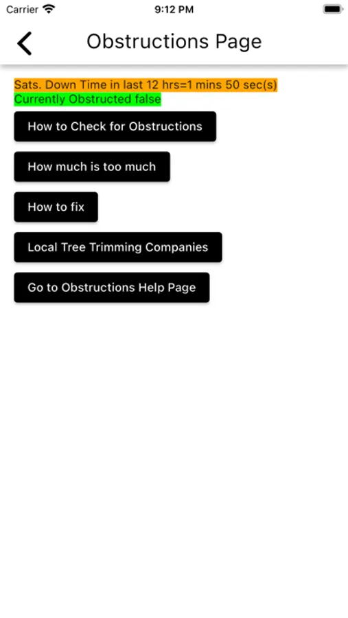 The Obstructions page will display if there is a current Obstruction between Dishy and a satellite, Uptime, Obstruction recommendations and status. In case the obstruction is a tree, the app has information on local tree trimming companies.