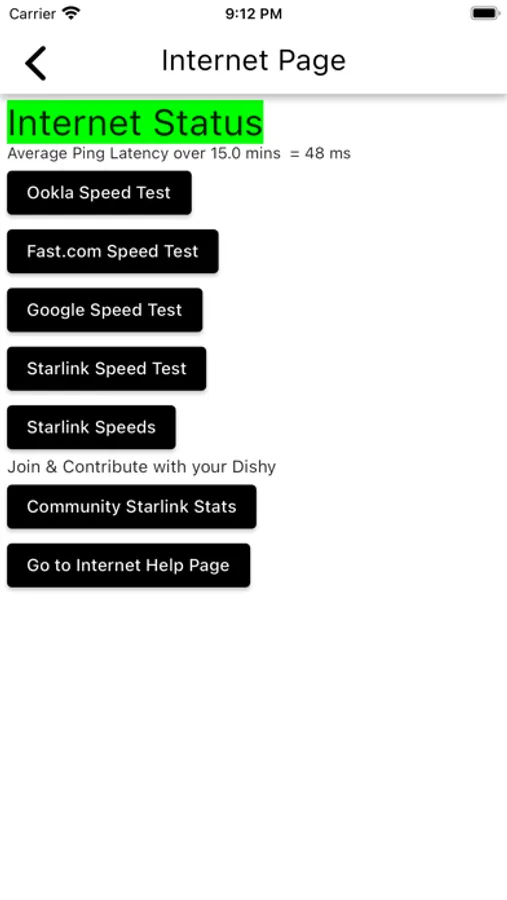 The Internet page will display whether the Internet is up or down, average latency times, Internet Speed time for Dishy(Direct Internet times), 4 different speed test checkers and Youtube links for instruction.