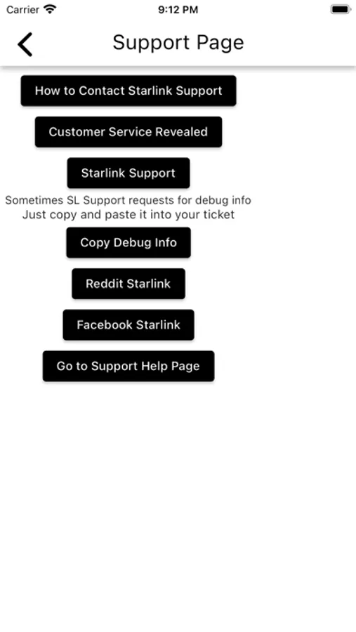 The Support page how to get Starlink Support, getting the debug information and links to popular Starlink support.