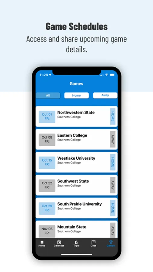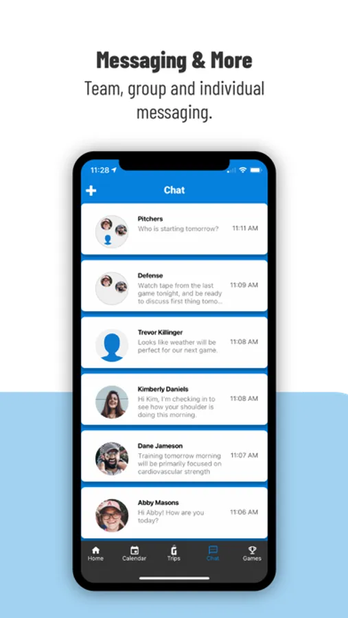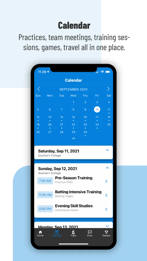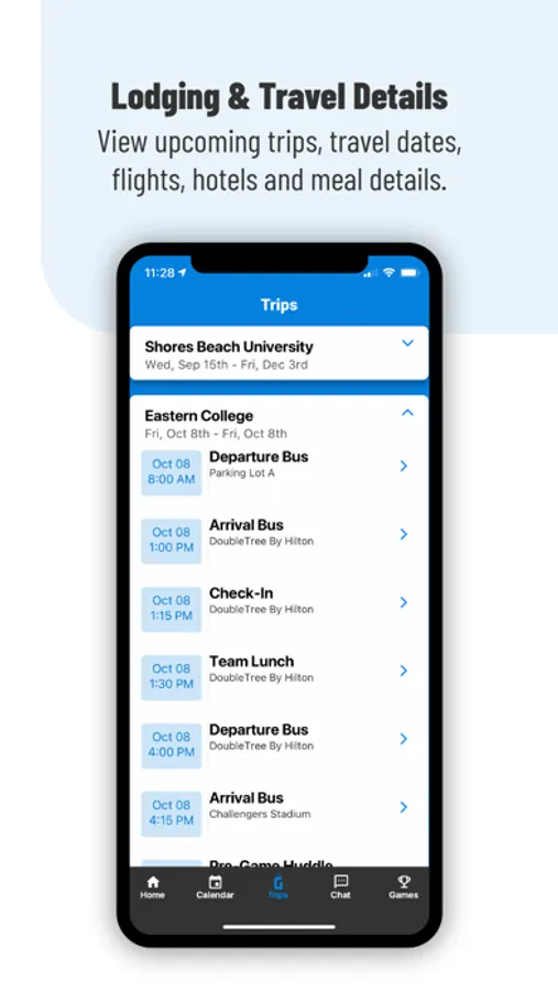 Simplify athlete’s schedules. Practices, team meetings, training sessions, games, and travel all in ONE place. Game Schedule: access and share upcoming game details. Trips: view upcoming trips, travel dates, flights, hotels, and meal details. Messaging: team, group, and individual messaging. Get notified: practice or travel updates, unread messages, or a new event has been added to your calendar.
