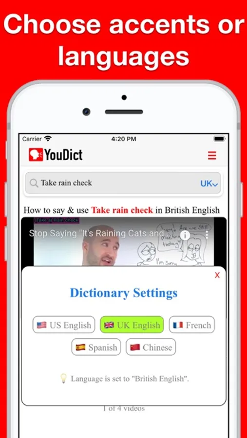 Choose your preferred accent or language whether it's English, Spanish, Chinese or another language. The app supports 5 different languages. More coming soon.