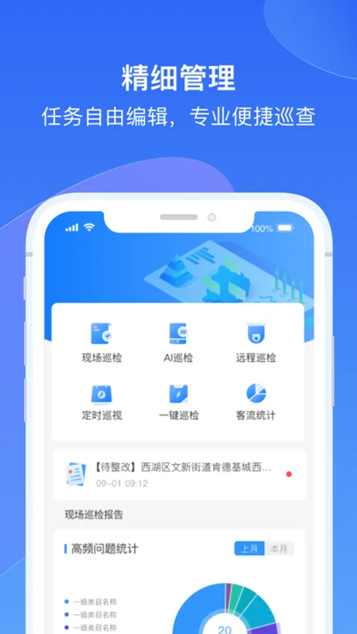 可自定义模版,设置多种任务;指派不同人员执行并跟踪巡检进度;接收巡检报告,发起整改/申诉,形成事件闭环;查看不同维度的执行情况数据分析;实现PDCA精细化管理。