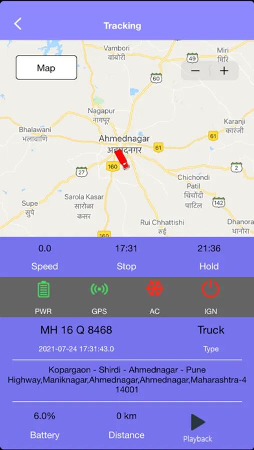 4. Tracking shows Real-Time Tracking location of Vehicle on the Map and also provide all the detail description of Moving, Stopped, Idle and Disconnected Vehicle with Date Time, Speed, Travelled KM, etc.