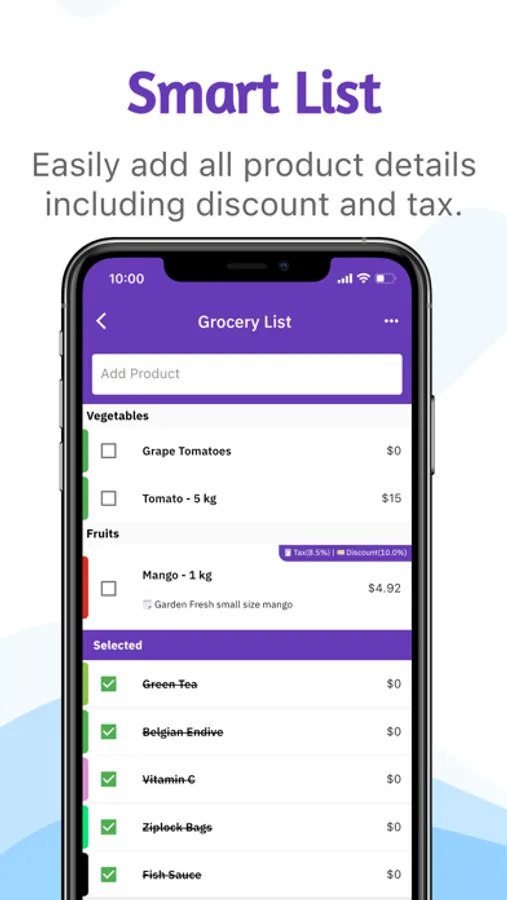Eliminate the hassle involved in grocery shopping by creating and managing your shopping checklist on this shopping organizer app. Explore different grocery shopping categories and quickly add items to your to buy list by tapping on the suggestions. Complete your list and save it for future use.