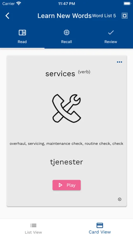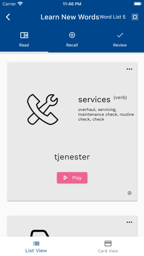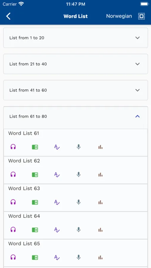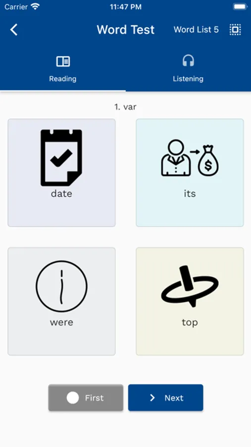 Lists are available for both words and sentences and provide an easy navigation method to all Listening, reading, and test screens. Each word list contains 20 words, and each sentence list contains 20 sentences. However, you can add any number of words to word lists and any number of sentences to a sentence list. When you listen/read to a list, the app shows all the items in that given list, excluding those you have marked as hidden. As you study more lists, you will realize that few words are easy to remember and don't need to be revised regularly. You can hide those words/sentences by clicking on the pop button.