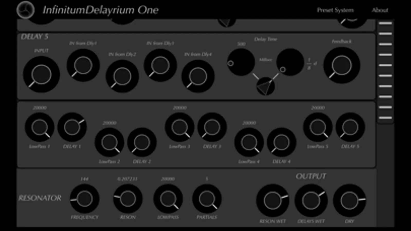 Infinitum Delayrium ONE is cascaded multidelay with input controls for delays and multiple feedback controls, at the output of the delays there are LowPass Filters and a Resonator.