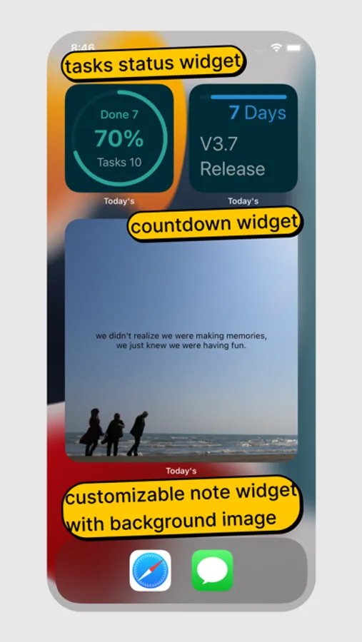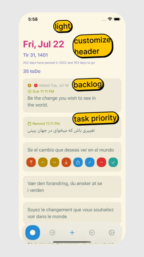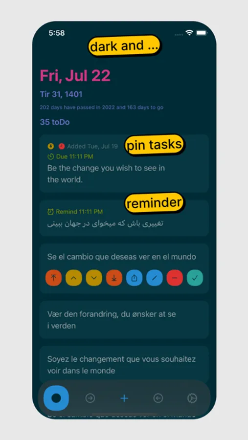 Today's Tasks ToDo makes managing tasks and setting reminders fast, clean, simple, and easy. You can view past days with simple statistics. The icon and the theme, which supports dark mode, are customizable. Date of today, number of past and remaining days in the current year, the time past since your birthday, a motivational or mantra short text and, count of today's tasks is in today's tasks tab, which is fully customizable in the settings.