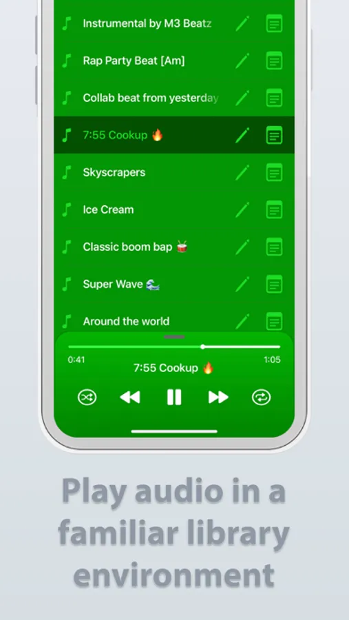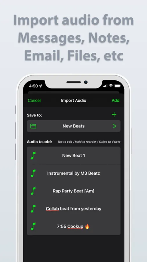 In addition to importing, organizing and playing, you may also export and share your audio to any destination via airdrop, messages, email and more!
