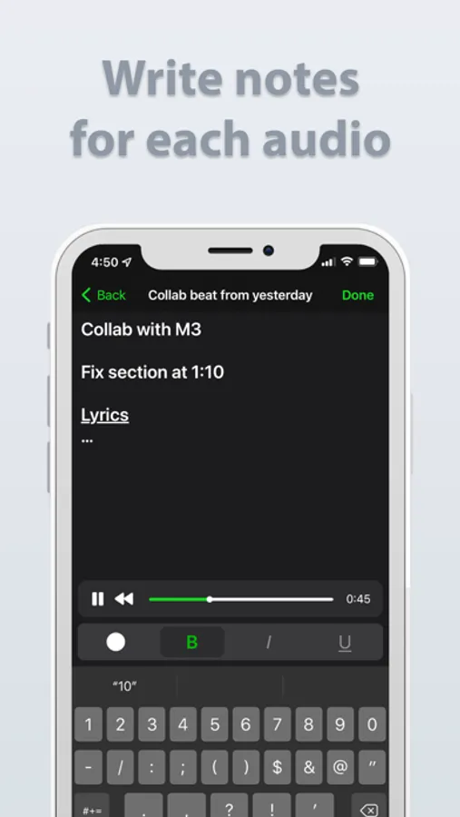 Each audio has its own unique "notes" section in which you can write and save specific details or lyrics.