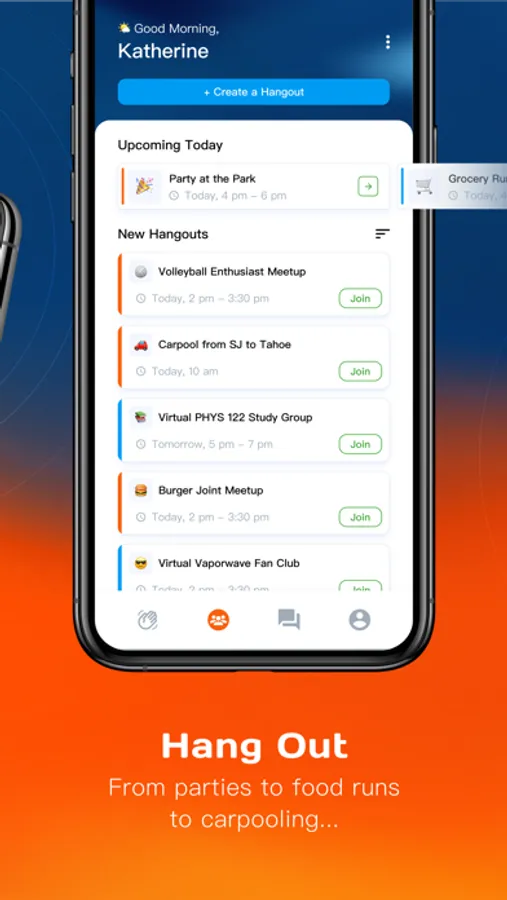 Explore Hangouts! Whether you want to party, grab lunch with new people, form a study group, or need to run an errand, you can create and explore social hangouts, trips, and events hosted by students at your university.