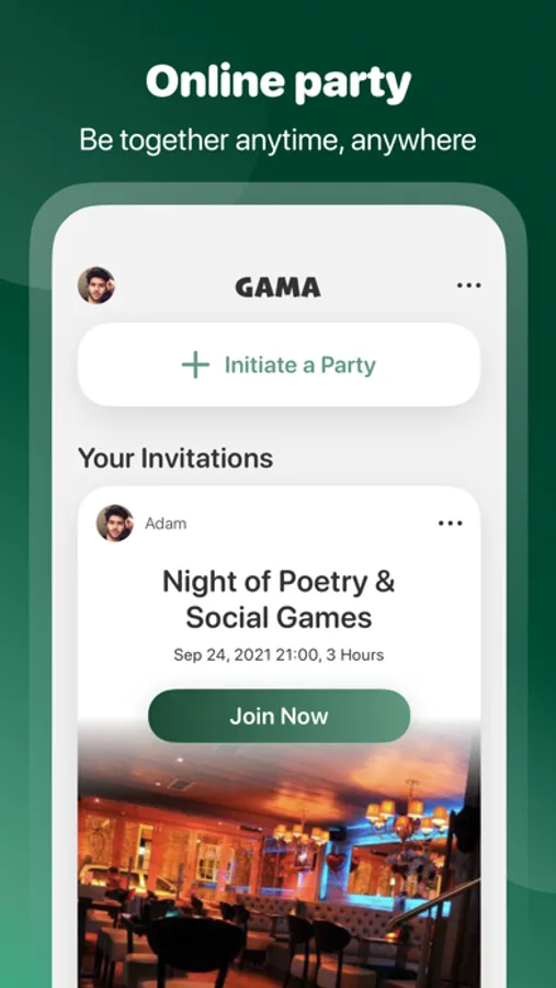 Gama is a group voice chat application for parties. You could party up with friends, chat by voice and play party games. It just likes a house party. But invite-only.