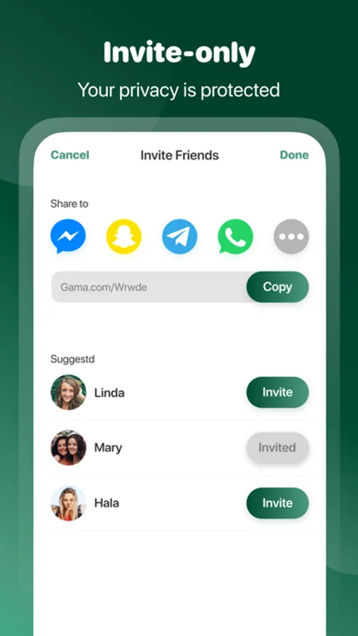 You could create a private place for party, and invite your friends on Gama or share links to Snapchat, WhatsApp, Telegram, Messenger, etc. Your privacy will be protected.