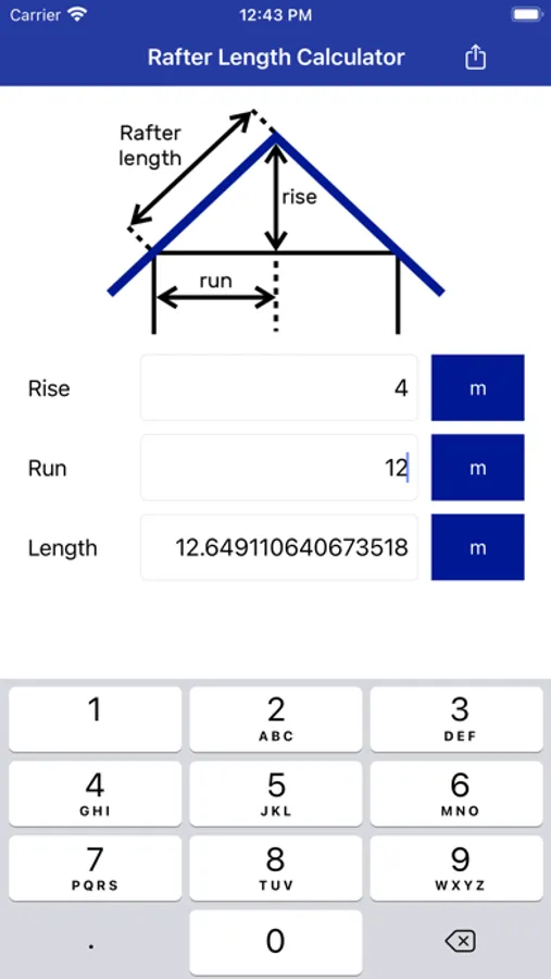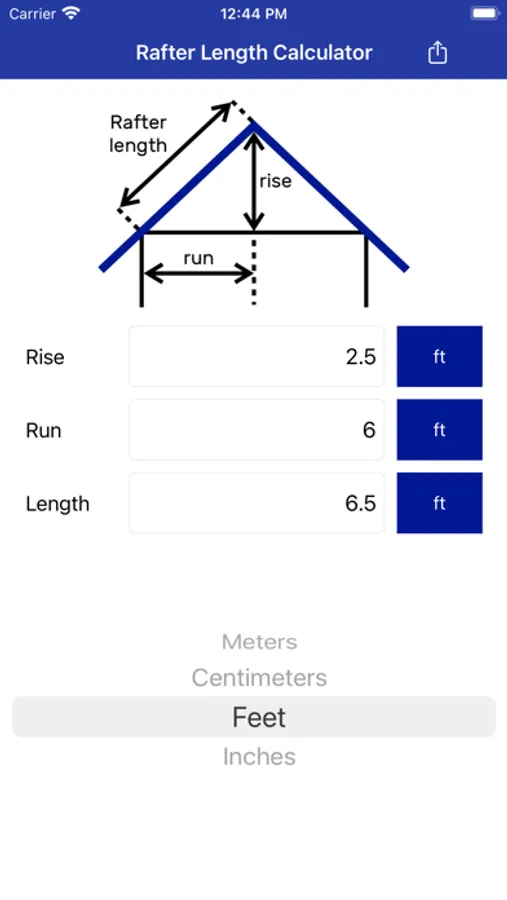 Just provide a Rise and a Run and you’ll get an Rafter Length, instantaneously.