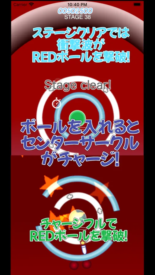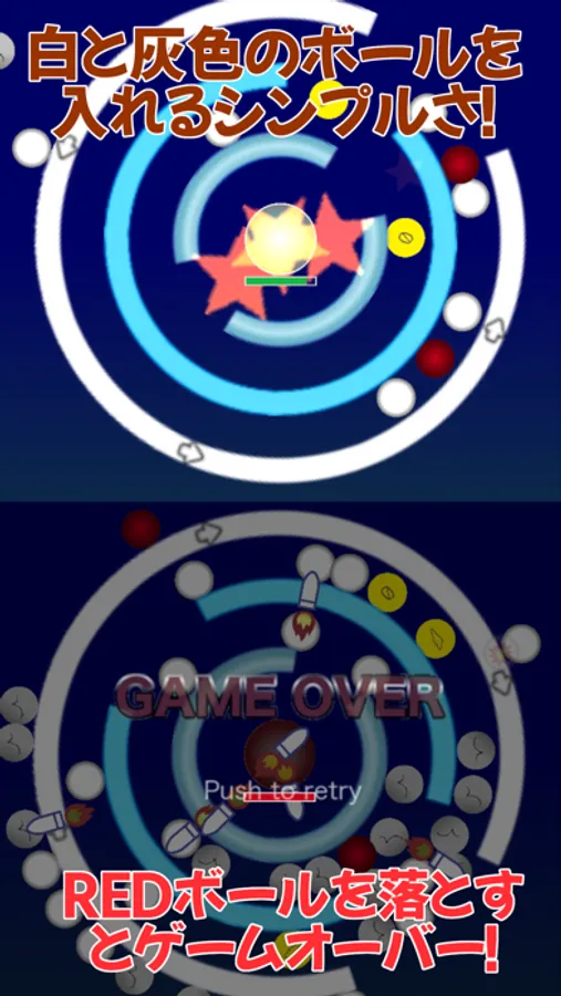 REDボールがセンターサークルに落ちるとゲームオーバーです。周りの青いディフェンスリングを操作して白や灰色のボールを落とすようにしましょう。