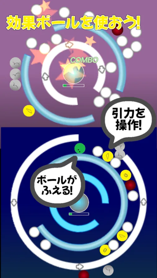 黄色や緑色の効果ボールをうまく利用してステージをクリアしていきましょう!