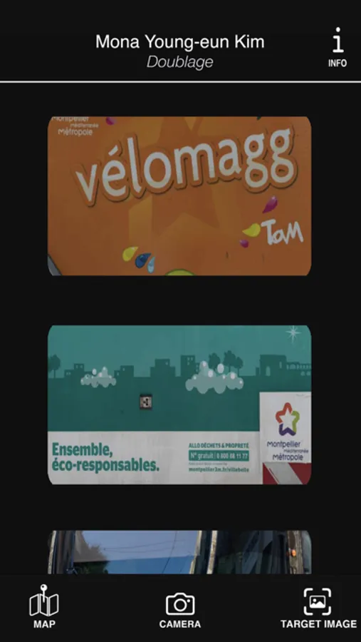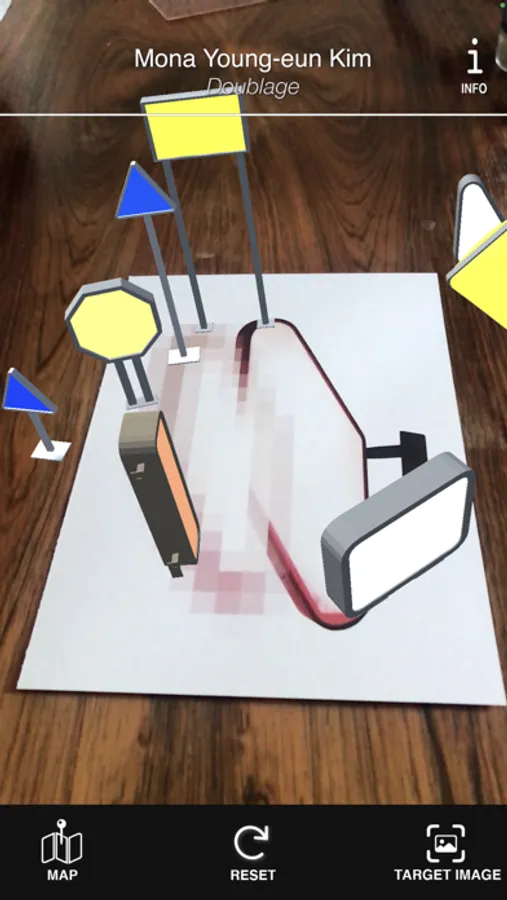 This Doublage project shares a vision of the evolution of the urban landscape in relation to language. I imagine a future where there would no longer be physical language installed in the world as letters, symbols or signs... because information would only be transmitted through the Internet and digital technology. To invite the spectator to a foresight of this future, the project will take the form of an in situ installation with mixed reality technology in several places in Montpellier - interior and exterior spaces. The technique inserts 3D models into the real world using a visitor's tablet or laptop. As we walk through these places, both real and virtual, we can discover the layers of perception depending on the accessibility of the technology and share a hypothetical reflection.