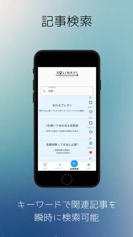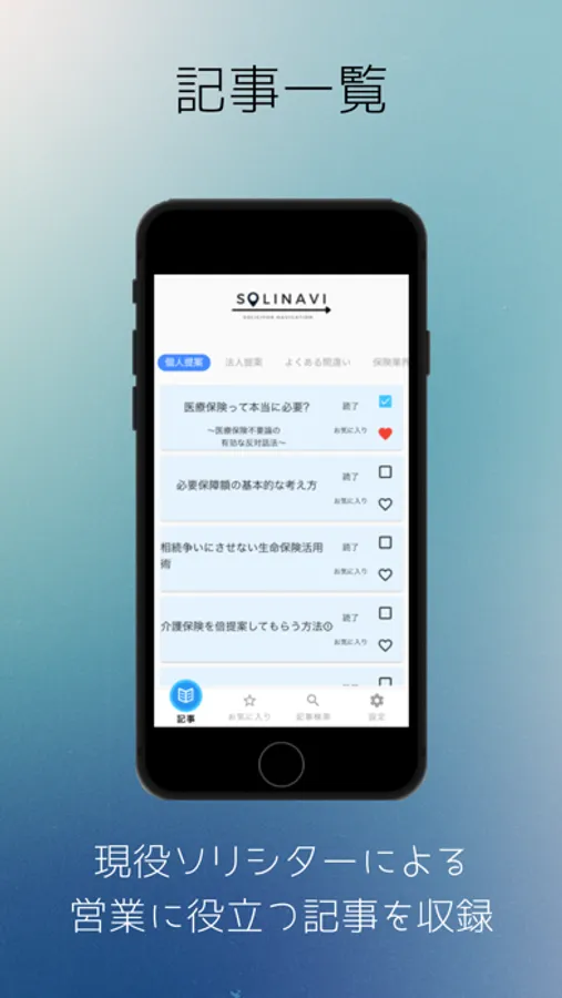 『Solinavi』は代理店営業担当者向けにいつでもどこでも日々の営業のヒント、学びを取得することができるナビゲーションアプリです。