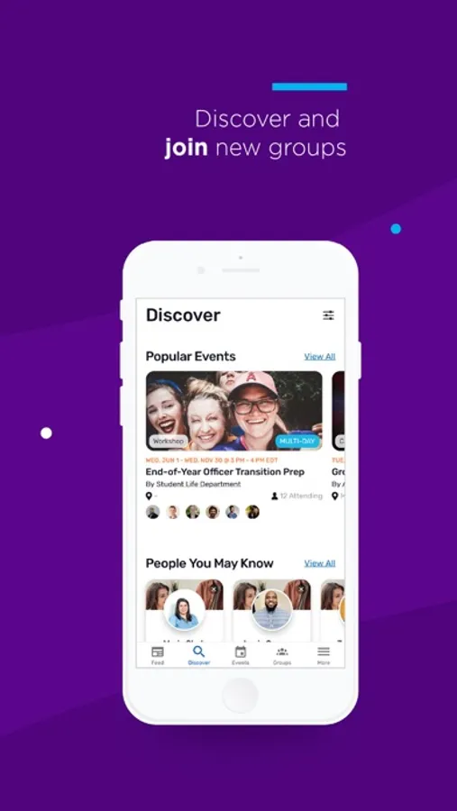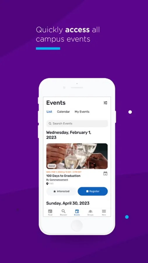 - EVENTS: Discover campus events and see what friends are also attending.