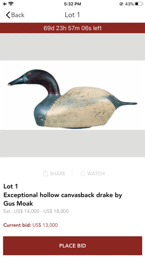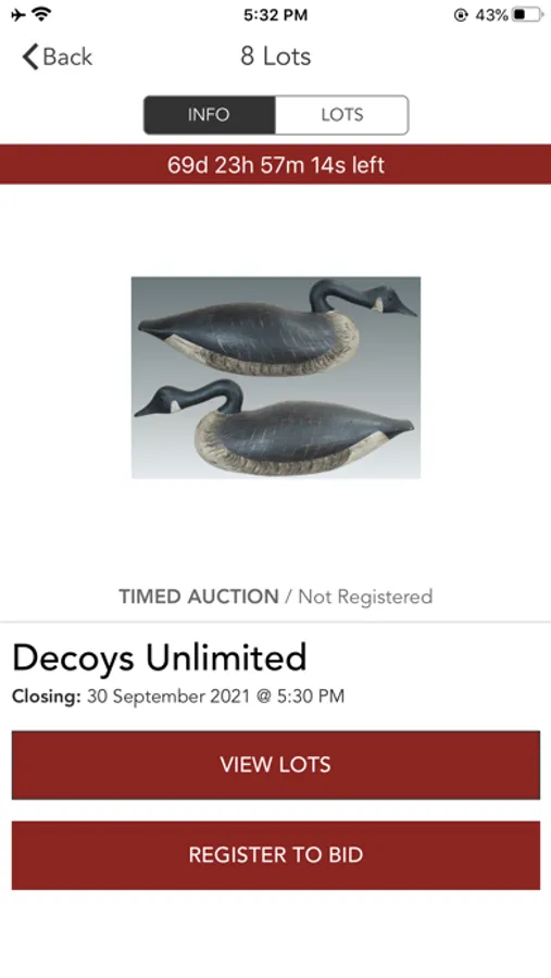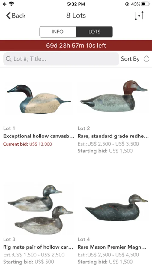 Decoys Unlimited Inc founded in 1986 has served the decoy collecting community with honesty, integrity and knowledge. We offer carvings for every level of collecting as well as art, books, and accessories. With the Your Auction House app, you can preview, watch and bid in our auctions from your mobile / tablet device. Participate in our sales while on-the-go and gain access to our following features: Quick Registration Following upcoming lots of interest Push notifications to ensure you engage on items of interest Track bidding history and activity Watch live auctions
