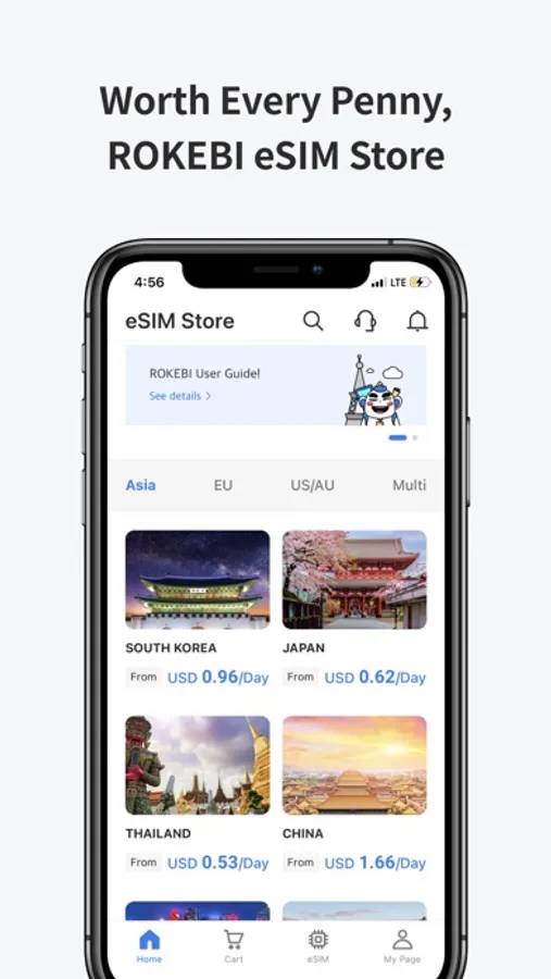 whenever you need, wherever you are, you can choose best data plan(starting from $0.53/day) by using ROKEBI eSIM while traveling without additional subscription to local telco service provider.