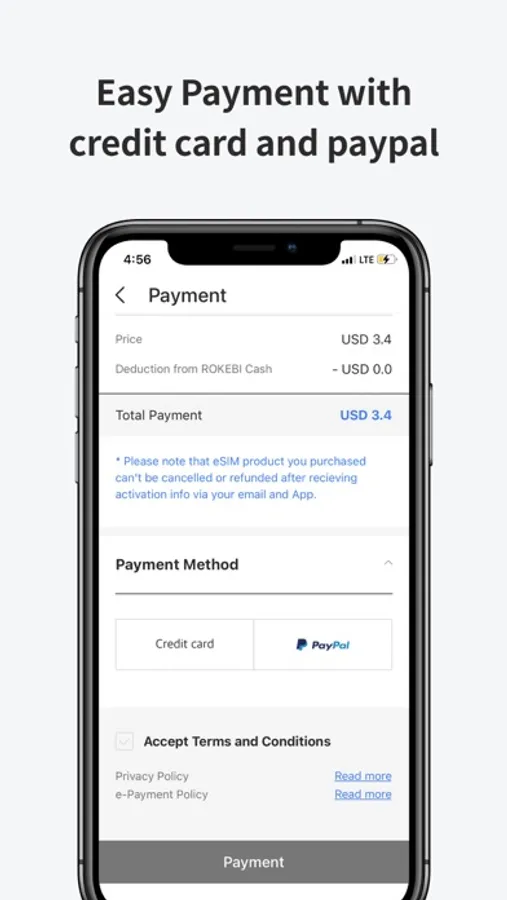 ROKEBI eSIM supports payment via credit card(VISA, MASTER, JCB, UNIONPAY, AMEX) and paypal. Upon completing payment, you will receive QR code and detail info via both of email and App.
