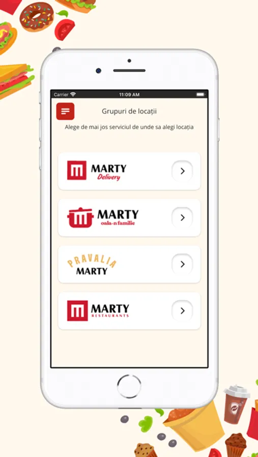 Marty Restaurants a pregătit pentru voi, cei mai dragi clienți, o aplicație mobilă! Prin aplicația noastră Marty Restaurants, vă oferim posibilitatea de a plasa cu ușurință o comandă, plăti prin intermediul aplicației și selecta din multiplele noastre variante de livrare. De asemenea, prin intermediul aplicației vei fi primul ce va afla de cele mai noi oferte, produse sau promoții Marty Restaurants. Descarcă aplicația și lasă-ne să îți răsplătim fidelitatea prin ofertele noastre valabile prin aplicație.