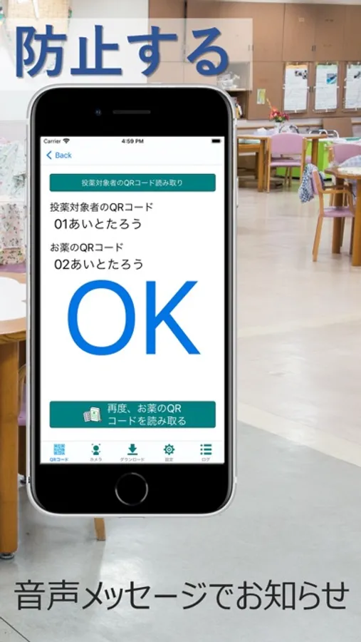 服薬対象者に渡す前に、服薬対象者の名札や食券などのQRコードを読み取り、QRコードが一致した場合、正しい投薬対象者であることを通知します。