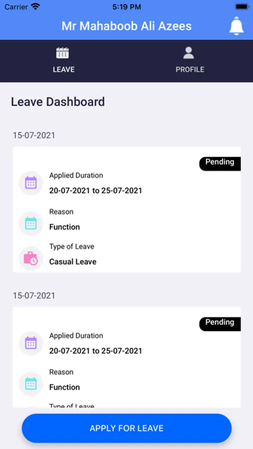 This app is based on Attendance System, User can apply leave at anywhere and they can check for their leave status.User can check their Attendance Report, Profile, Holidays etc..,