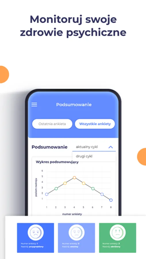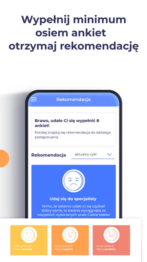 Uzupełniaj regularnie ankietę opracowaną przez specjalistów i otrzymaj rekomendację na temat Twojego stanu psychicznego.plikacja wspomagająca monitorowanie stanu psychicznego. W celu otrzymania rekomendacji, systematycznie wypełniaj opracowaną przez specjalistów ankietę.