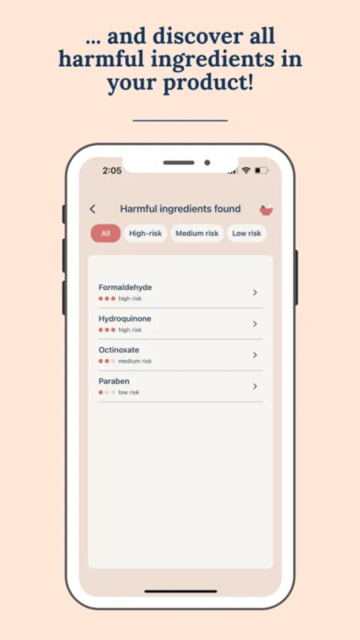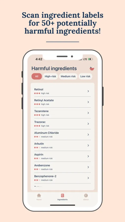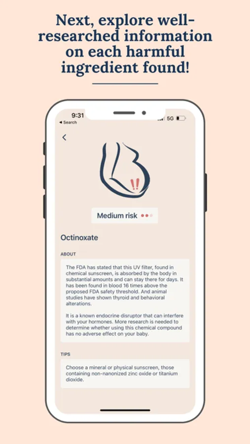 We make it simple to access continuously up-to-date information on potential low-, medium-, and high-level risks and side effects associated with ingredients found in common beauty products. By consulting medical professionals and peer-reviewed research studies, we’ve built a database of over 50 types of chemicals, additives, as well as natural and processed ingredients frequently found in beauty products. You can also find tips and suggestions for safer, pregnancy-friendly alternative products and ingredients inside the app!