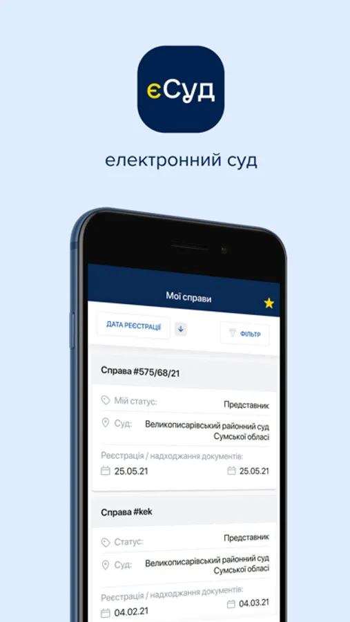 Офіційний мобільний застосунок Електронного суду в Україні «єСуд» забезпечує швидкий та комфортний доступ до сервісів Електронного суду безпосередньо з мобільних пристроїв. Для використання застосунку необхідно зареєструватися в електронному кабінеті: https://cabinet.court.gov.ua.