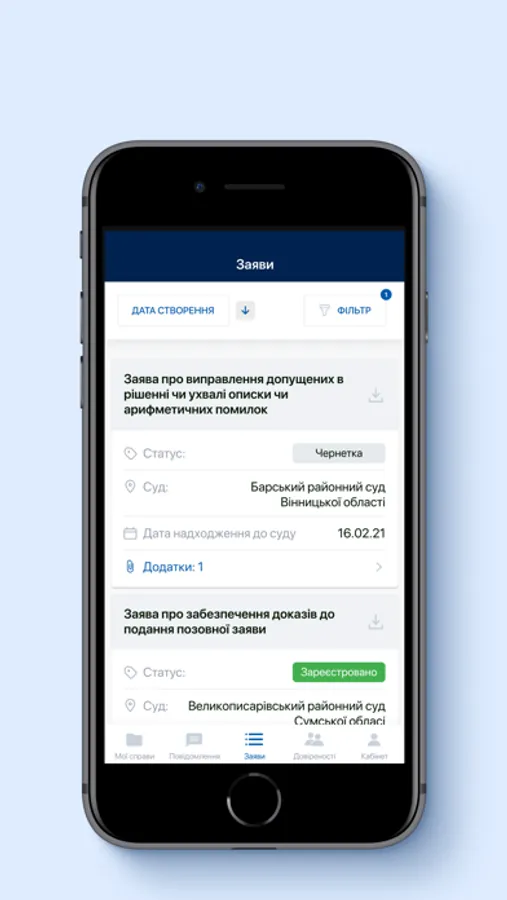 • переглядати заяви, клопотання та інші документи, які Ви створили в кабінеті;
