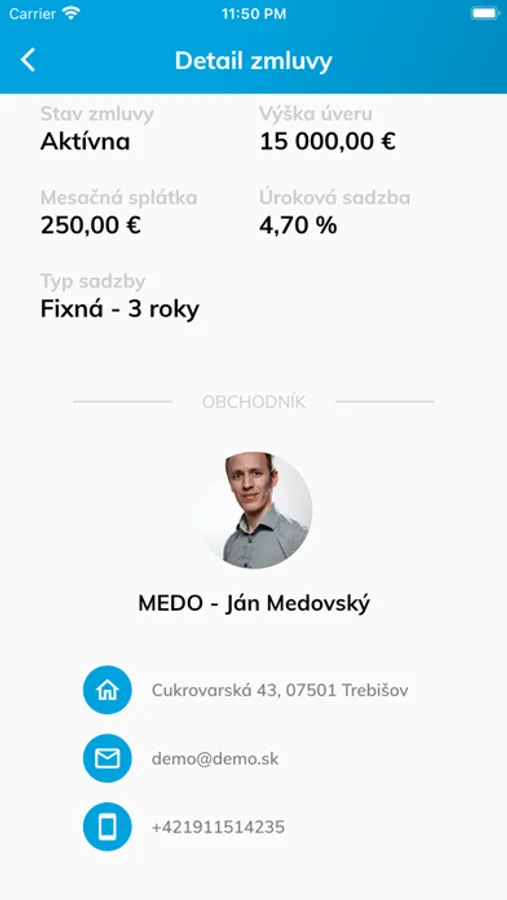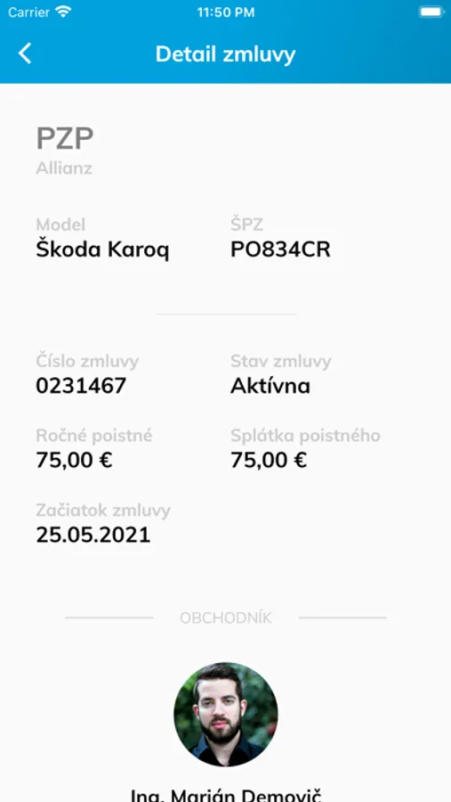 → Kontakt na finančného sprostredkovateľa – pri každej zmluve nájdete kontakt, na základe ktorého môžete kontaktovať vášho finančného sprostredkovateľa emailom alebo telefonicky priamo z aplikácie.