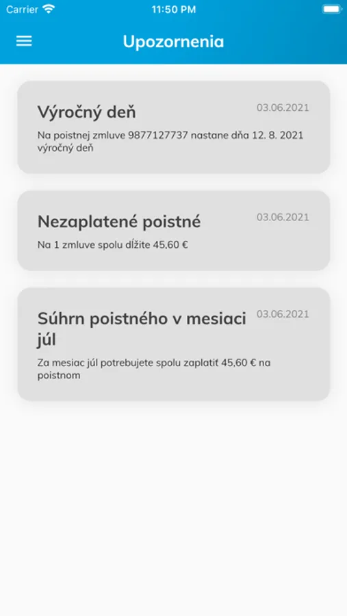 → Upozornenia – aplikácia vás vždy upozorní na všetky dôležité udalosti týkajúce sa vašich zmlúv.