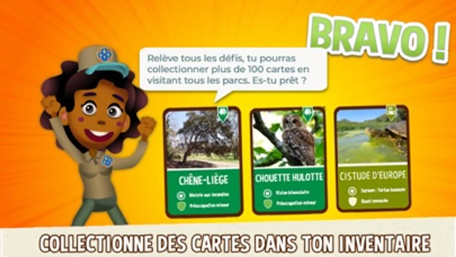 Tu pourras compter sur les gardes nature qui seront dans le jeu pour te guider et t'accompagner tout au long du parcours. Si tu réussis les défis, tu gagneras des cartes à collectionner, à retrouver dans ton inventaire.