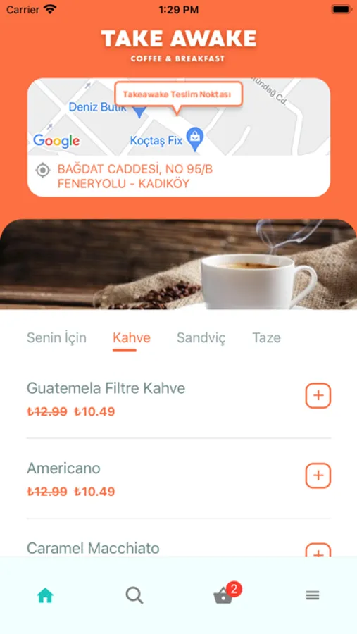 Aracını park etmeye, inmeye, dükkan önünde sıra beklemeye son...Uygulamamızdan online vereceğin kahve veya kahvaltı siparişini aldıktan sonra, gerçek zamanlı yer tespiti sayesinde, trafik hızından bağımsız olarak siparişin taze ve tam zamanında hazırlanır. Take Awake’e yaklaşırken kaldırım kenarında bekleyen ekip arkadaşımız tarafından aracından inmeden sana teslim edilir. Kahvaltını aracında yemek istersen siparişin, sana özel önlüğün ve kahvaltı kutun ile teslim edilecektir.