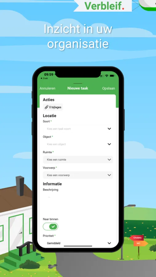 Een digitale oplossing voor vakantieparken en vastgoed beheerders. Gemaakt voor het beheren van taken en meldingen voor bijvoorbeeld schoonmaak, groenvoorziening, technische dienst en overige terrein gerelateerde werkzaamheden.