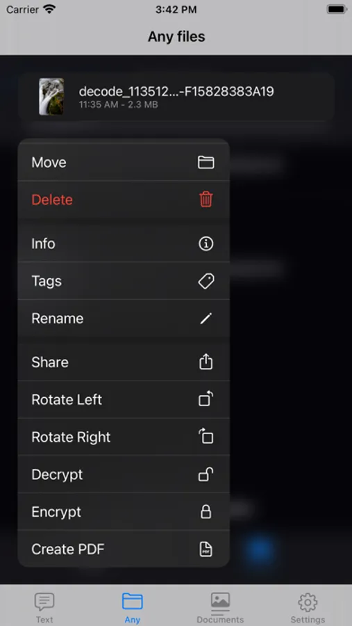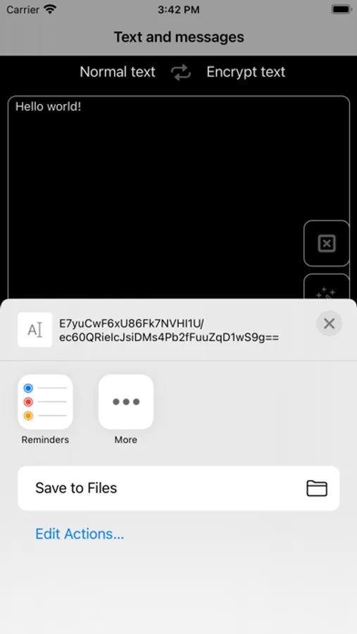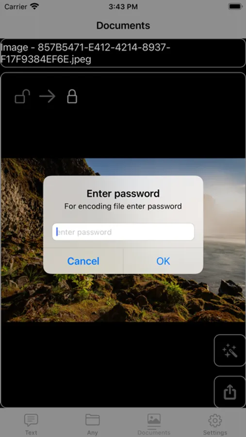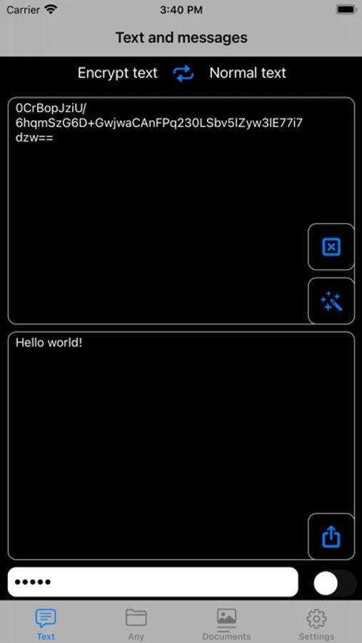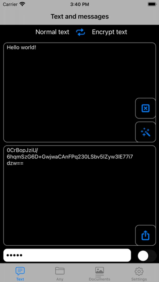 This application is designed to encrypt and decrypt text, documents in the form of pdf, jpg, png, as well as any files. You can control the encryption process by changing the password. The application also allows you to share the result of encryption and decryption processes with other applications, for example: messengers, cloud storage, file managers, mail applications.