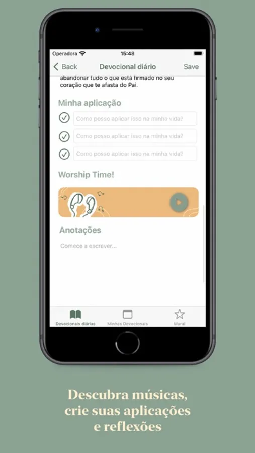 • Meus Devocionais: Crie e compartilhe devocionais em Meus Devocionais, adicionando uma base bíblica, reflexão e até mesmo uma música!