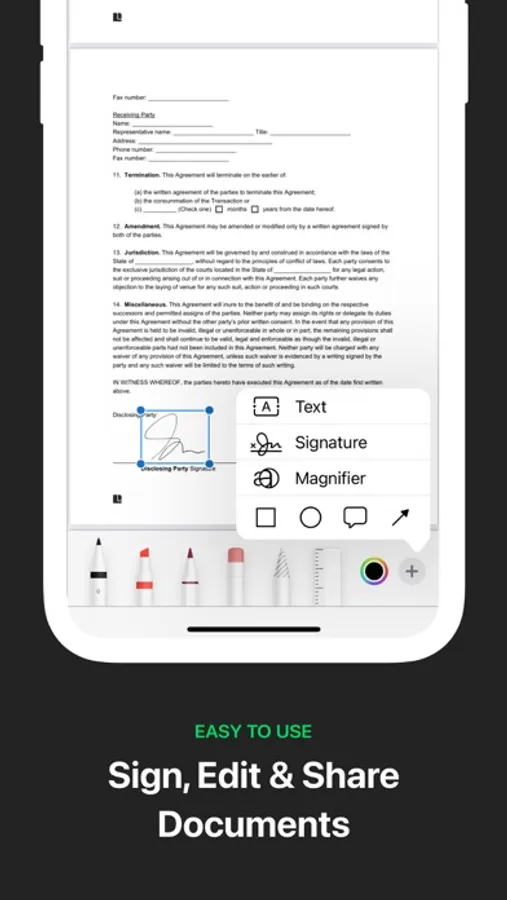 - Share completed documents through iMessage, Whatsapp, Email, and more.