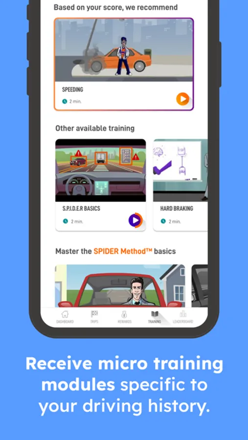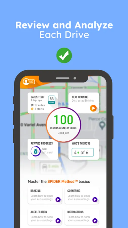The coach helps teen drivers and their parents (mentors) understand their safe driving strengths and weaknesses and improve their driving by analyzing their driving patterns and providing feedback with each trip. For areas that need improvement, the Coach suggests short S.P.I.D.E.R. driver's ed videos and game-like training modules bespoke to their needs.