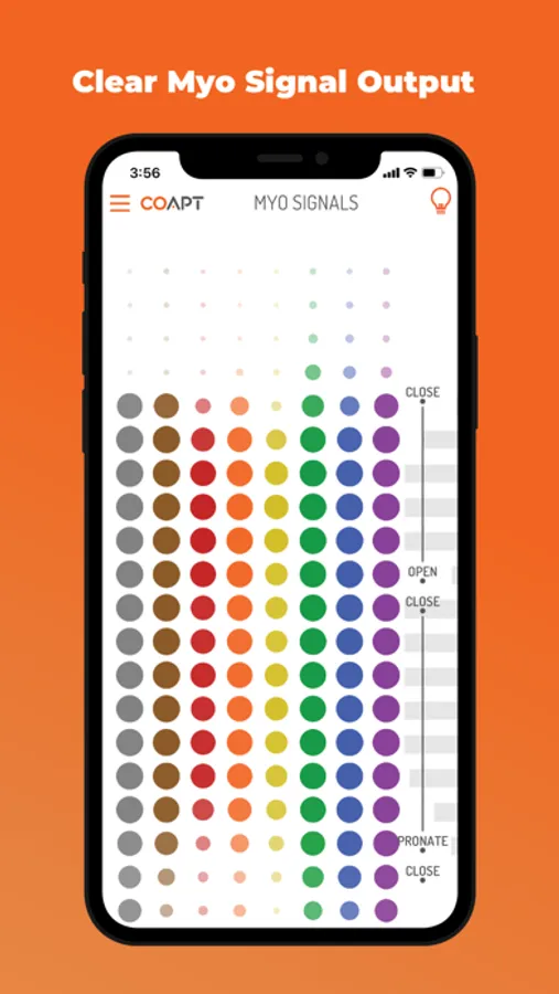 • Real-time dynamic view of the myoelectric pattern as related to the 8 Coapt myoelectric (EMG) input signals.