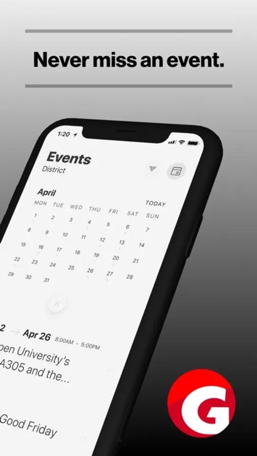 The event section shows a list of events throughout the district. Users can add an event to your calendar to share the event with friends and family with one tap.