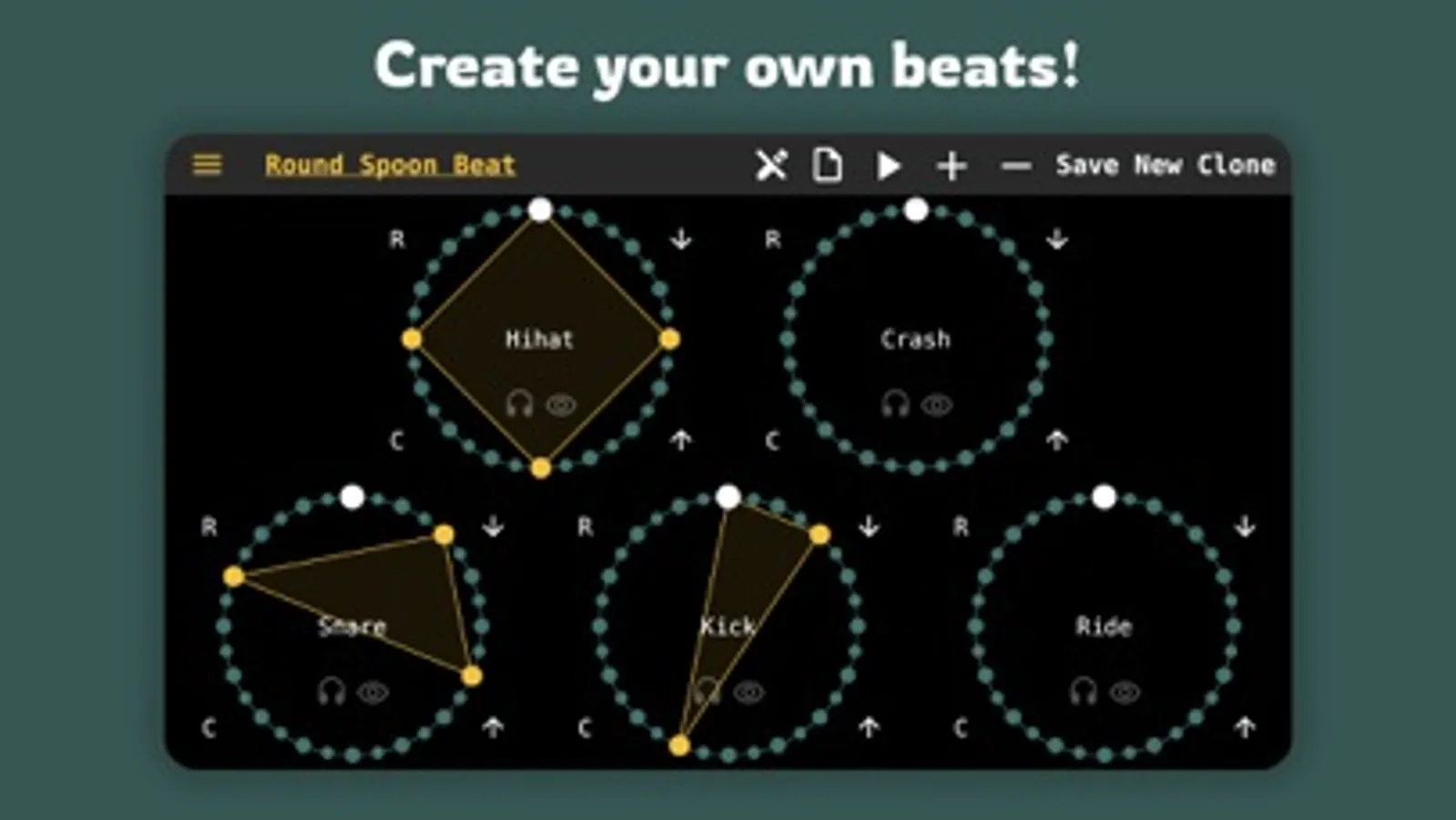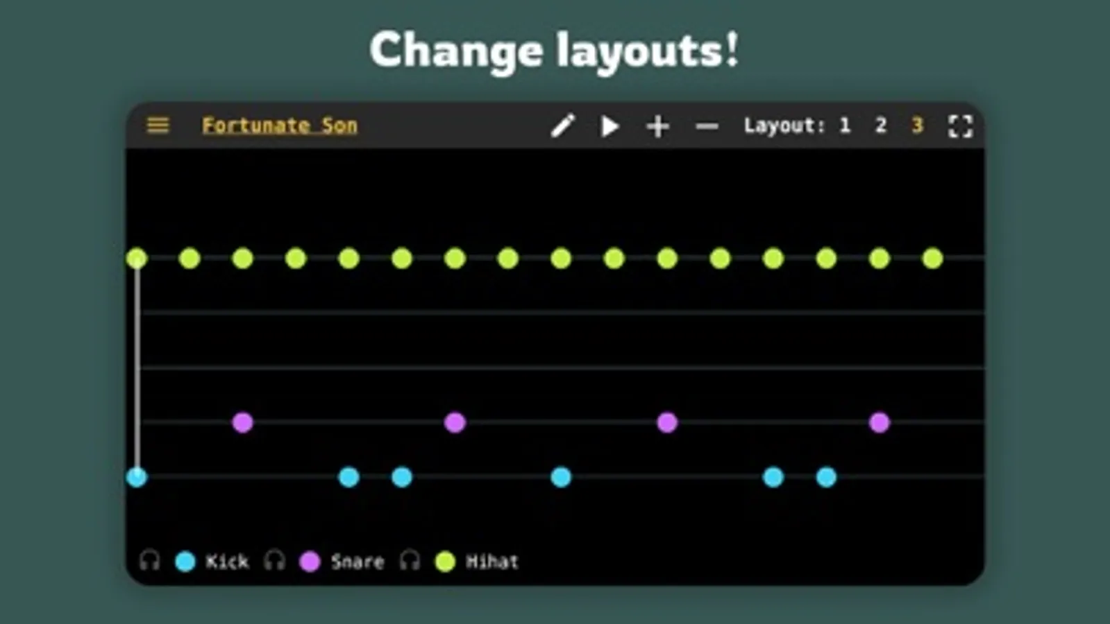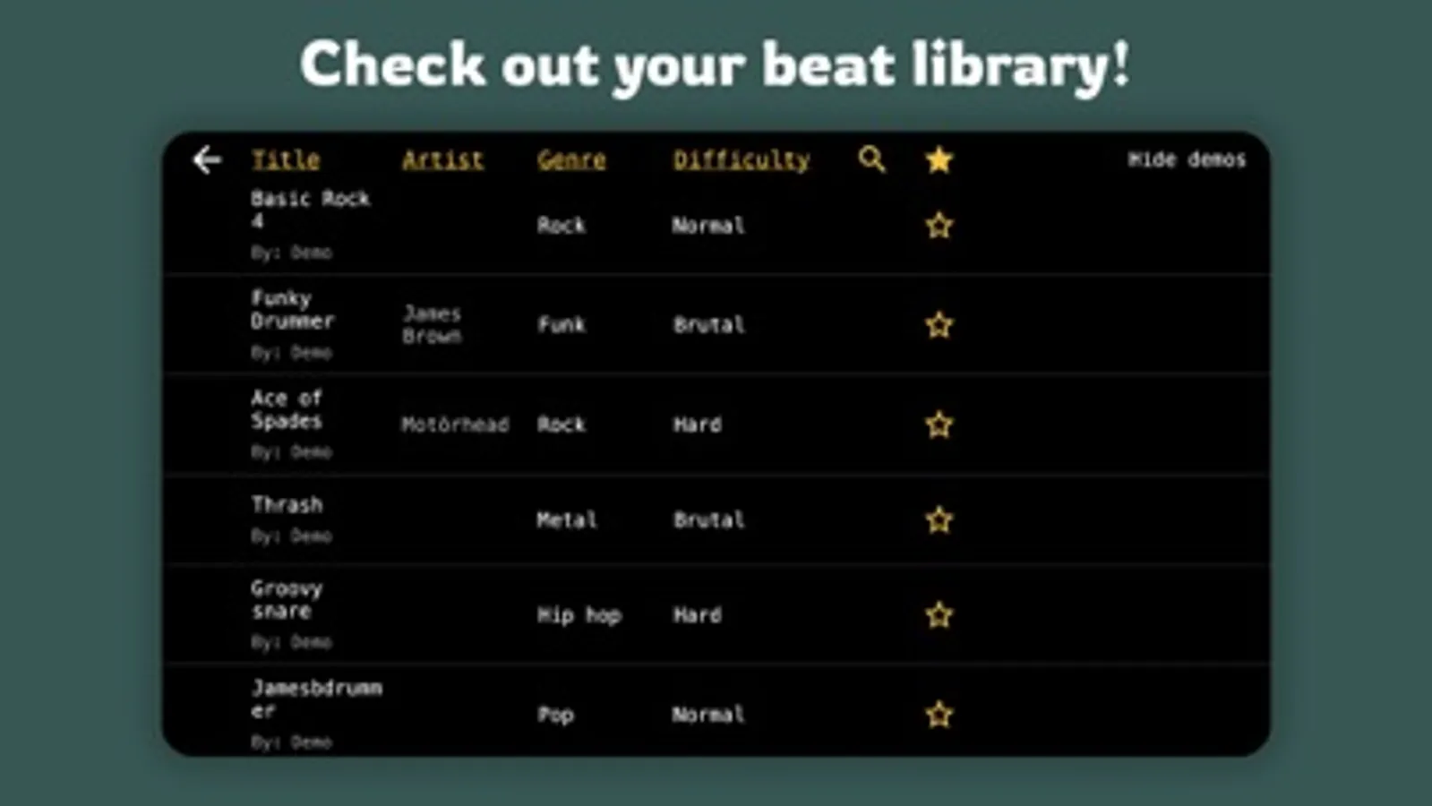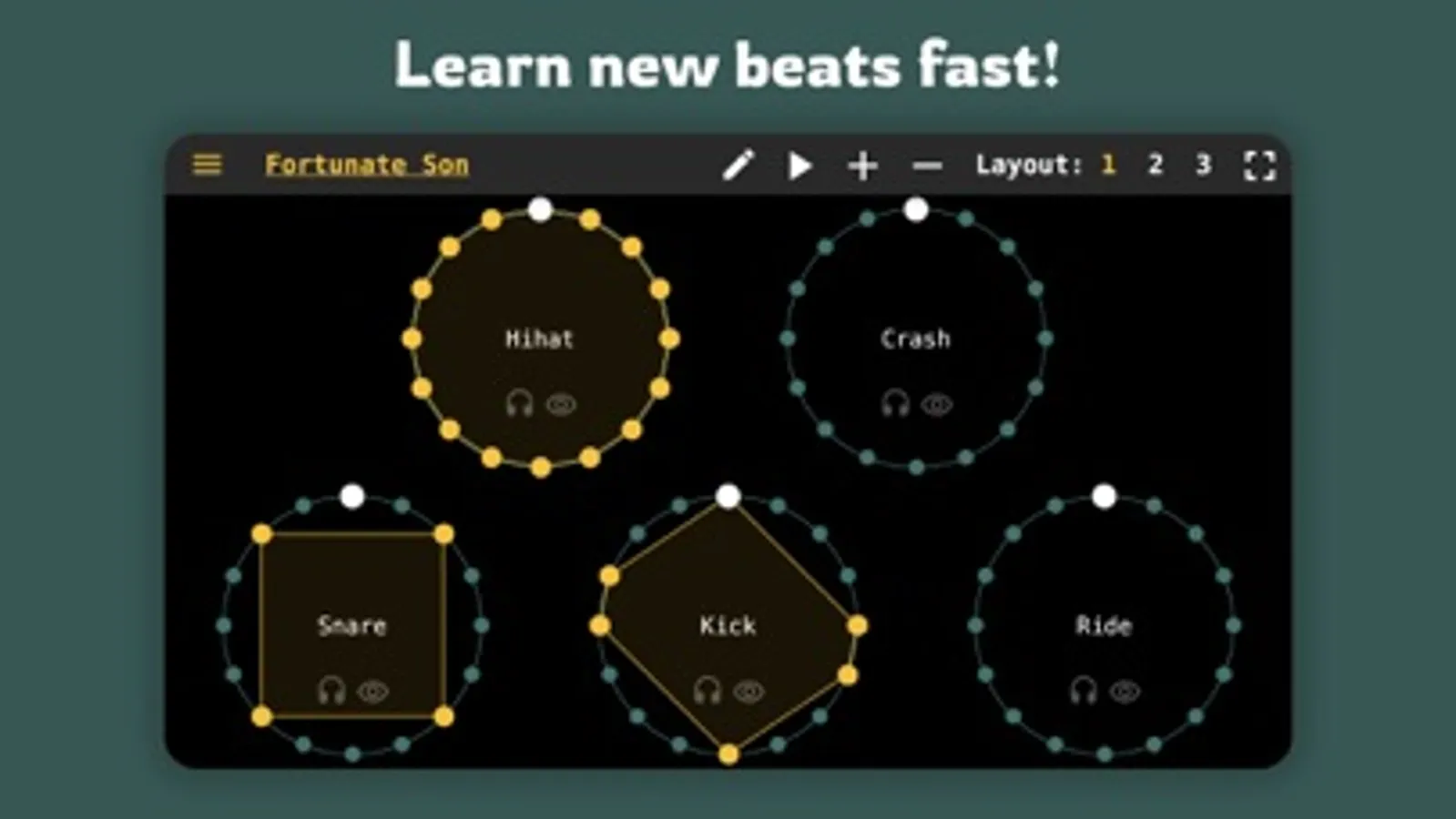 Learn beats fast, create your own or try beats made by others in the community. By soloing out or slowing down parts of the beat, you can learn it step by step until it sticks! You change how you want to see the beat, then play after it in full screen. You can also upload and download beats with others from the community.