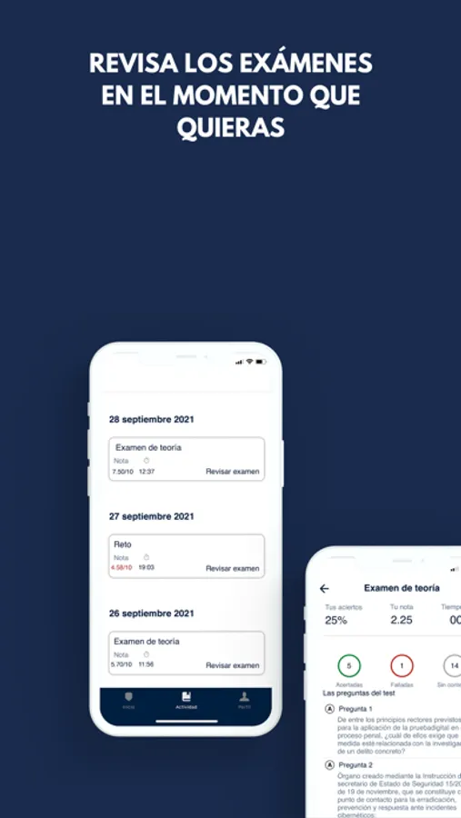 4. Tendrás acceso a las revisiones de cada uno de los exámenes que hagas, con acceso total a las explicaciones de cada pregunta.