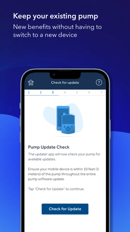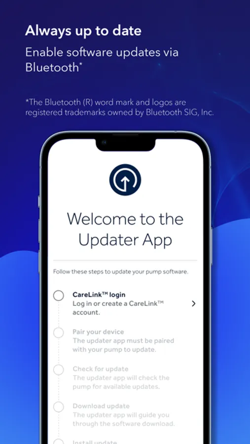 The Updater app connects with the MiniMed™ 700-series pumps via Bluetooth* communication. The software update process with Updater app puts you in control, giving you the freedom to update pump software remotely. And it does it all using the same pump you already have on hand.