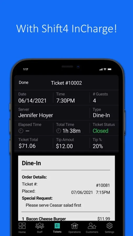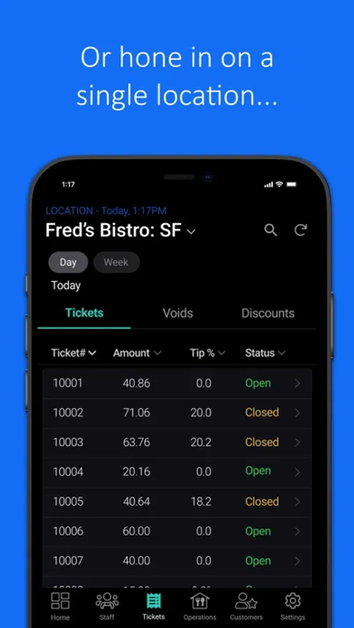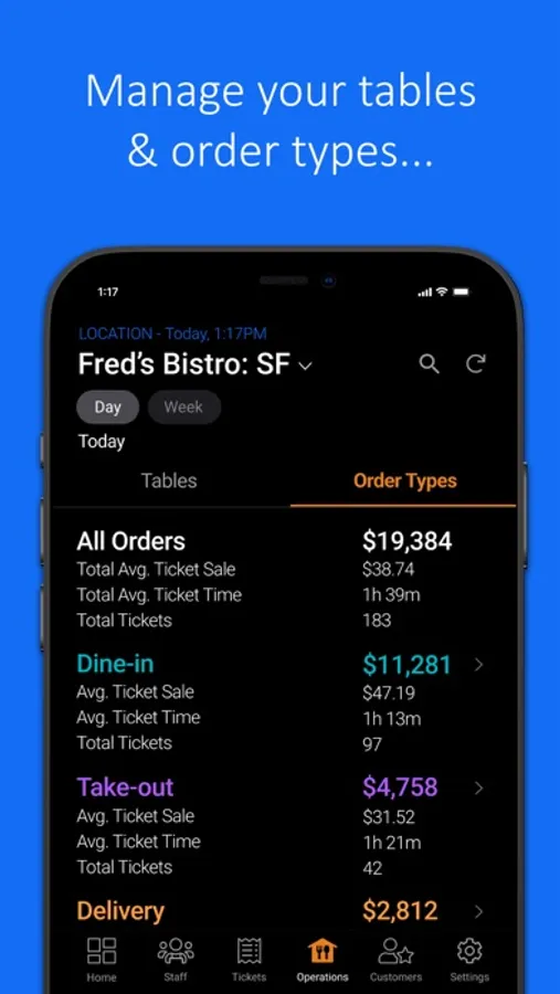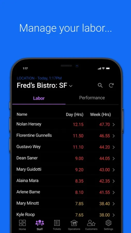 - View staff member performance, including hours, sales, tips, ticket time, and more