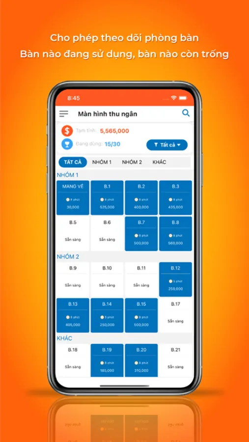 VMENU Giúp bạn theo dõi tình trạng phòng bàn sử dụng thuận tiện, quản lý được phòng bàn nào còn trống, phòng bàn nào đang từ dụng từ xa.